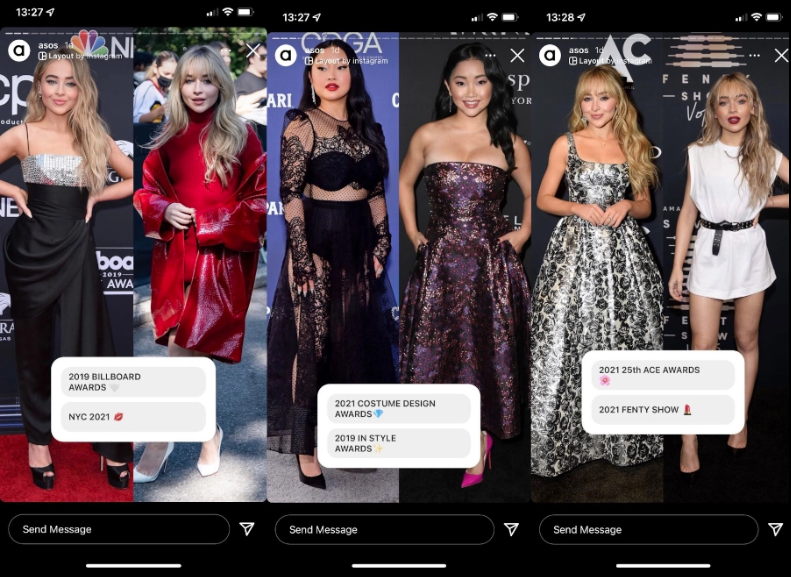 For instance, ASOS made a series of images that showed celebrities’ outfits and included a poll sticker that encouraged viewers to vote for their choice as shown above. Since people love sharing their thoughts, the example mentioned above performed well, giving ASOS a solid reason to boost these Stories and turn them into the next ad campaign.